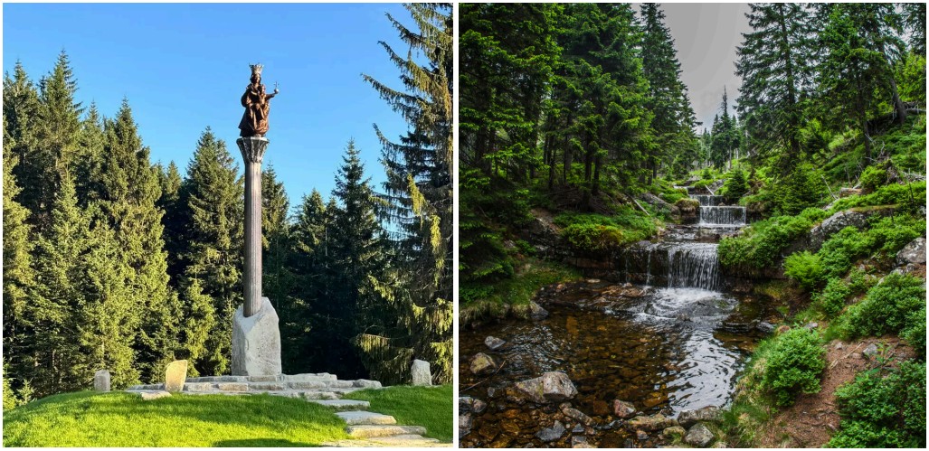 Trasa povede ze Špindlerova Mlýna z centra po červené TZ na Dřevařskou cestu, dále po žluté TZ na Boudu u Bílého Labe. Odtud budeme pokračovat Čertovou strouhou na Josefovu boudu, kde stojí nový Mariánský sloup – Královna hor. Dále projdeme kolem Erlebachovy boudy a po zelené TZ se budeme vracet zpět do Špindlerova Mlýna přes Jelení boudy.